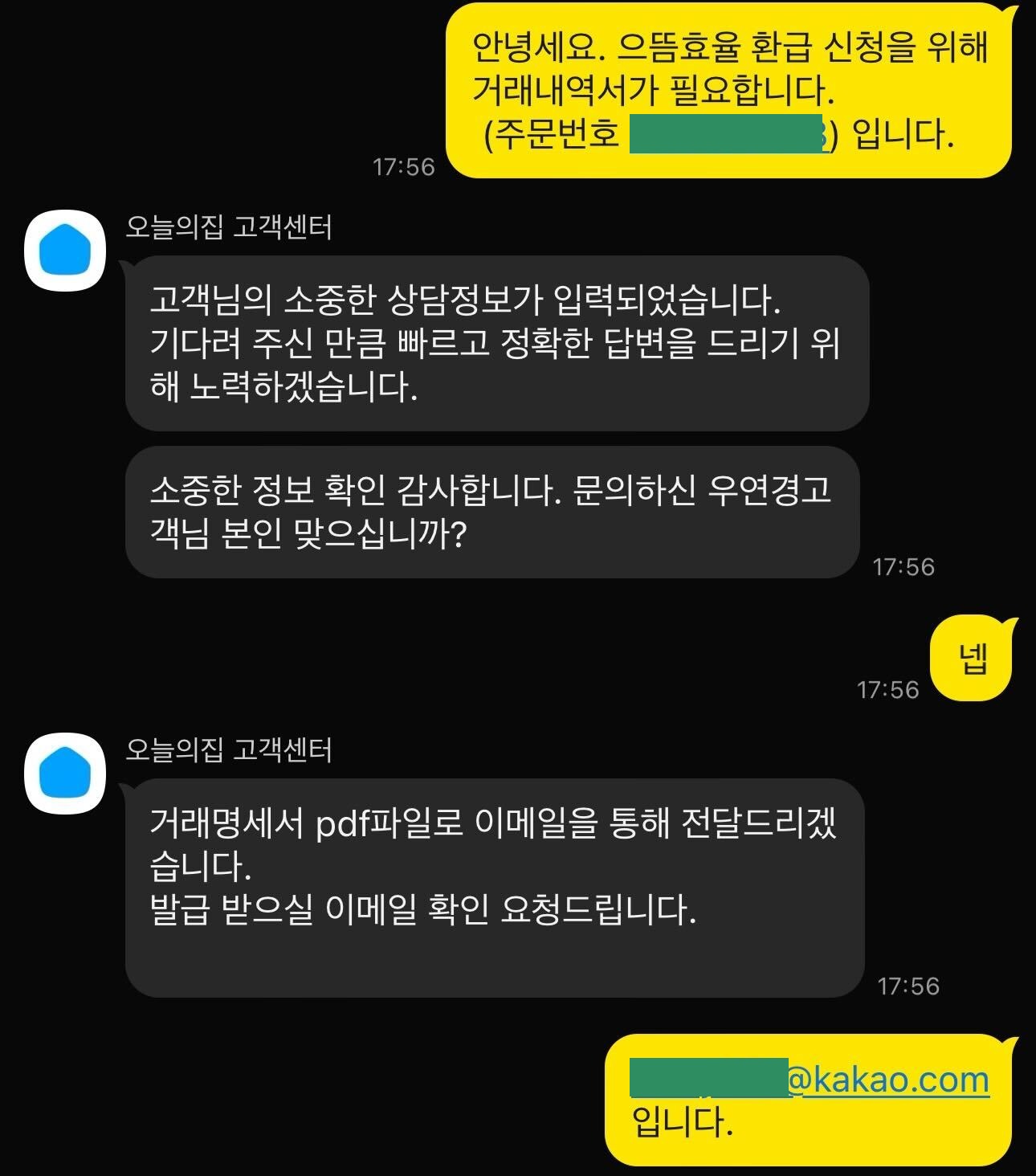 카톡으로 연결된 상담사에게 "으뜸효율 환급 신청을 위해 거래내역서가 필요합니다" 라고 카톡하면