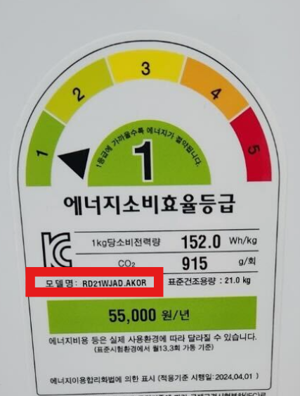 실제 라벨에 나와있는 모델명은 RD21WJAD.AKOR 이였으며 건조기는 또 따로 다르게 적혀있었습니다.