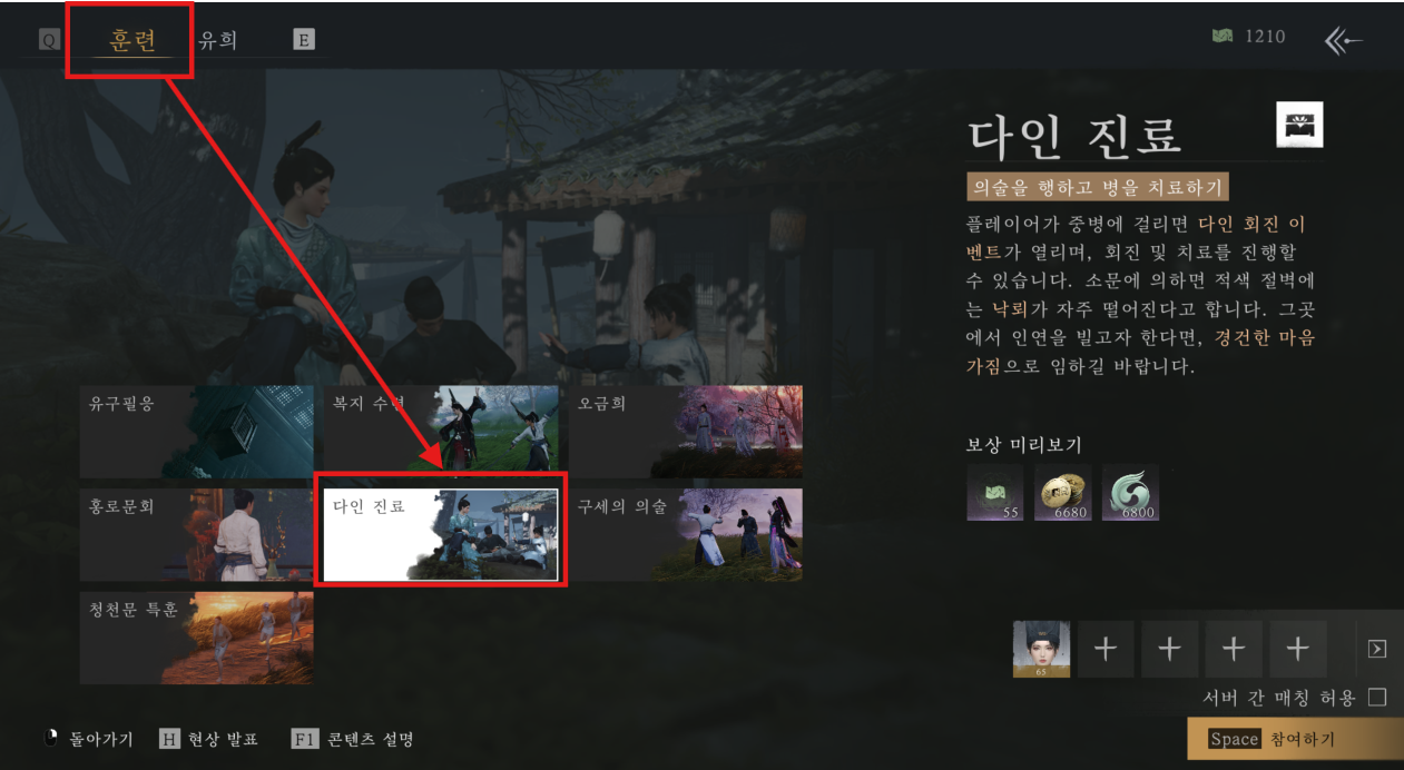 메뉴 > 강호행 > 교류협동 > 상단에 '훈련' 탭 > 다인 진료